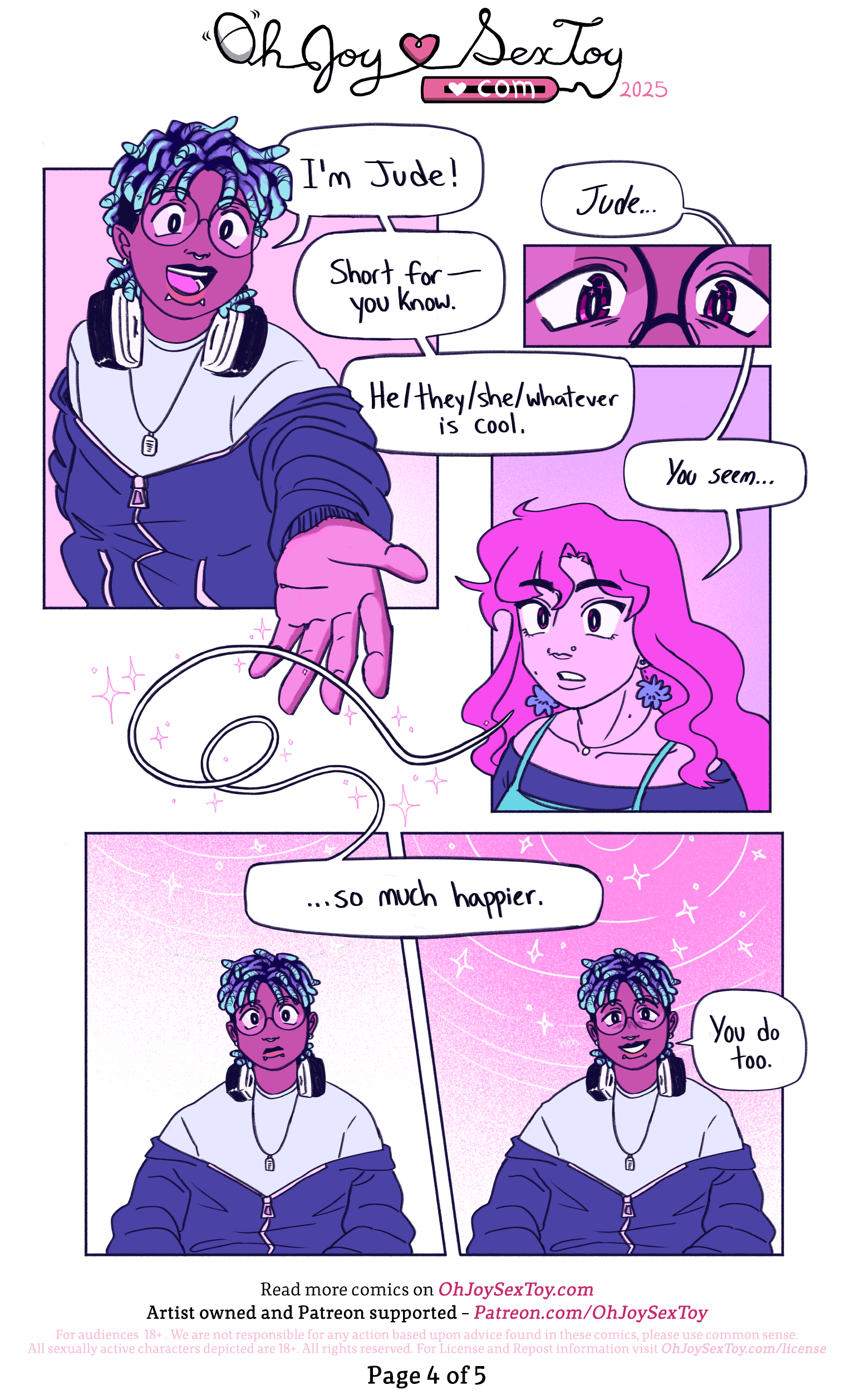 Thrusting her hand out, he announces, "I'm Jude! Short for- you know. He/they/she/whatever is cool."