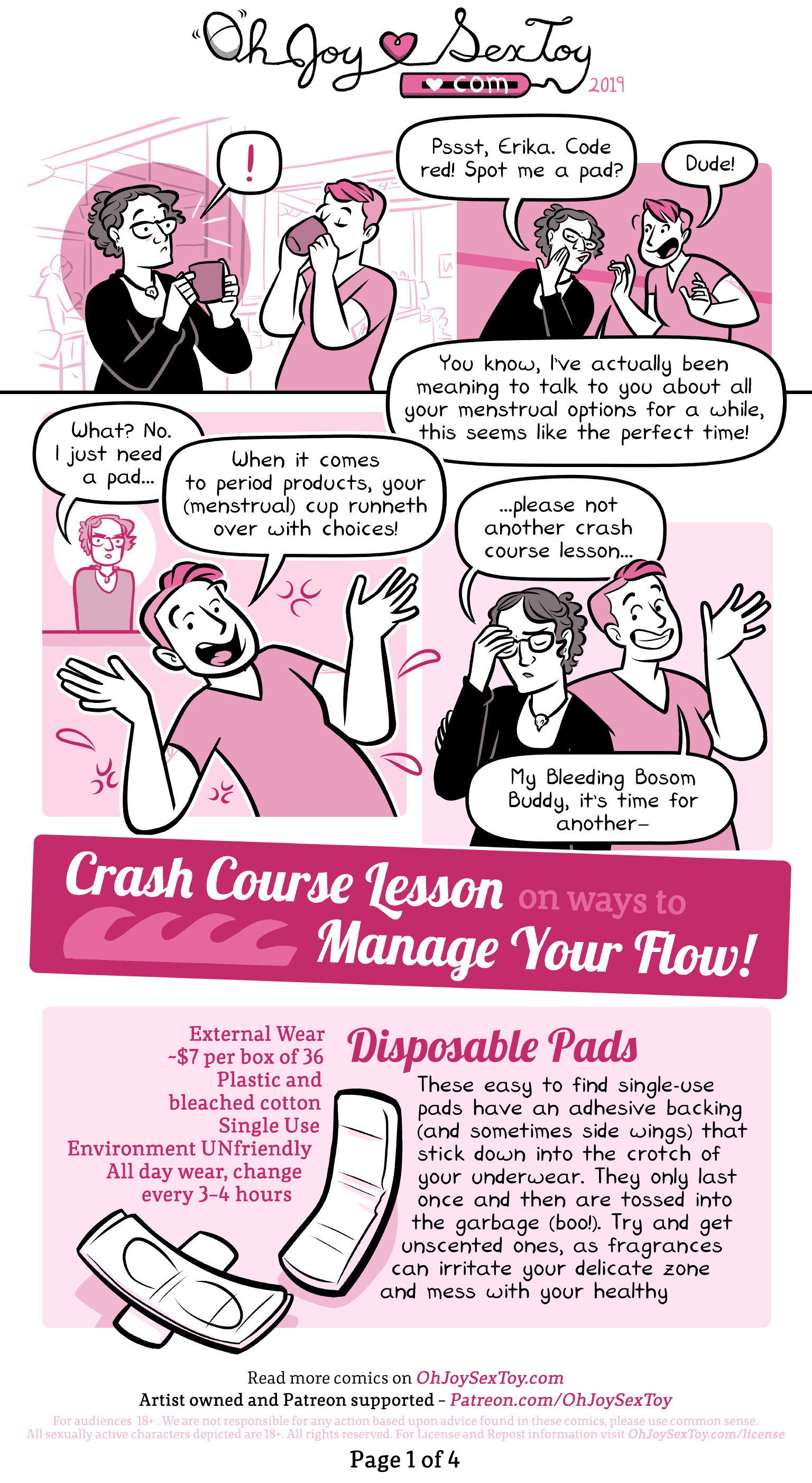 Erika puts her arm around their shoulder as she says, “My Bleeding Bosom Buddy, it’s time for another - Crash Course Lesson On Ways to Manage Your Flow!”