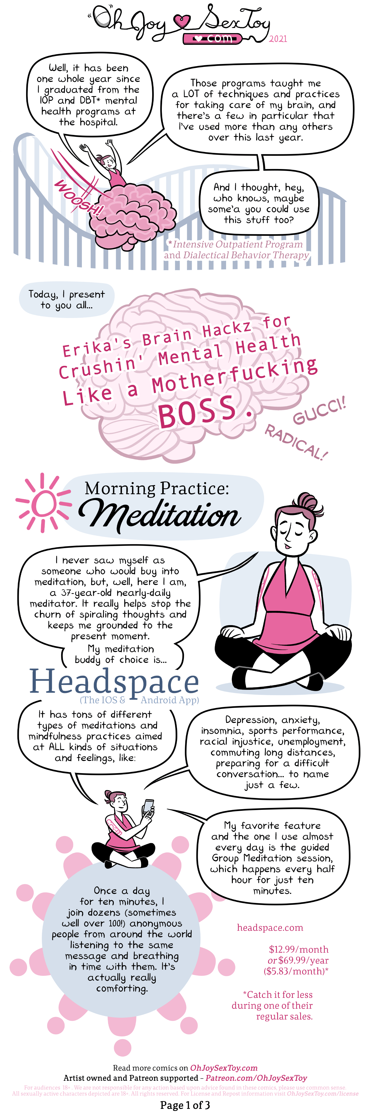 To be honest, I’m struggling to write something here. When I was freshly out of the Intensive Outpatient Program, I made a comic talking about my experience there plus reviewed a vibrator, so, y’know, killin’ two birds with one stone there. More recently I made a comic explaining The Stress Response Cycle, which I touch on here but if you’re hungry for more information, well, go read that one. Brains, man! Brains.