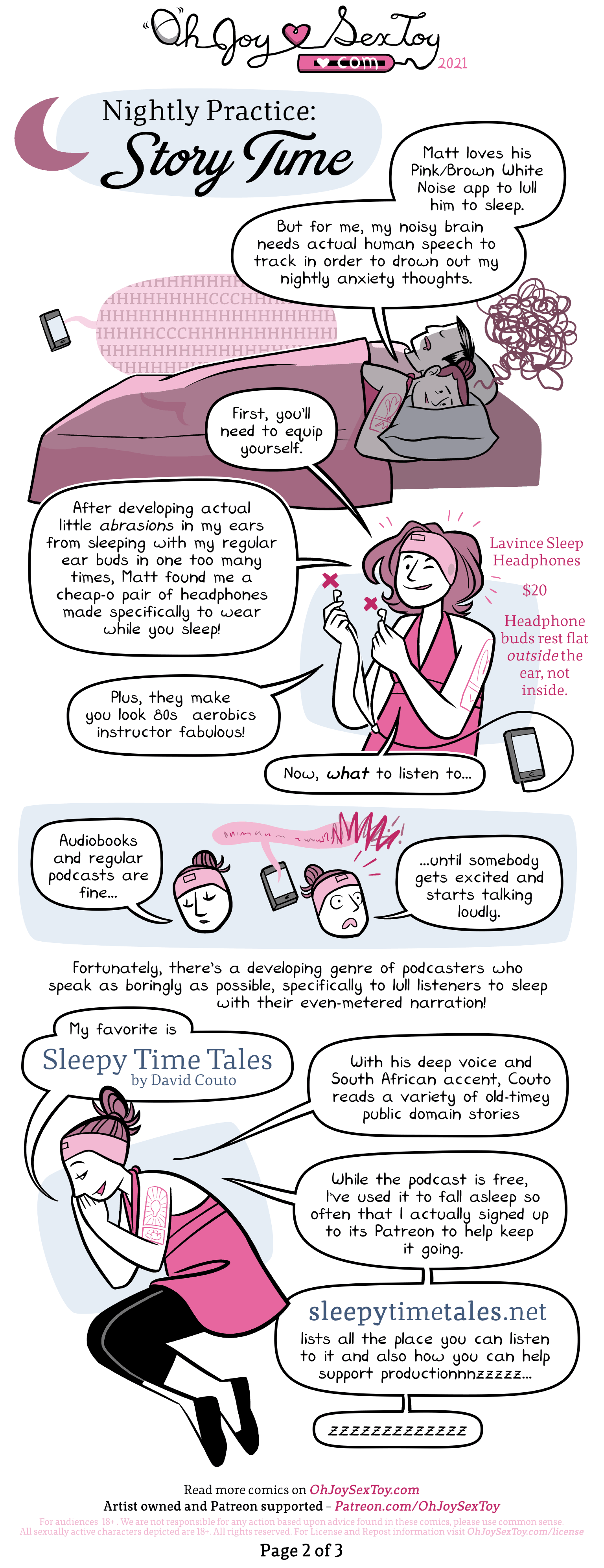 Erika curls up to sleep wearing her sleep headphones. She says, “My favorite is Sleepy Time Tales by David Couto. With his deep voice and South African accent, Couto reads a variety of old-timey public domain stories. While the podcast is free, I’ve used it to fall asleep so often that I actually signed up to its Patreon to help keep it going. Sleepytimetales.net lists all the places you can listen to it and also how you can help support production…”