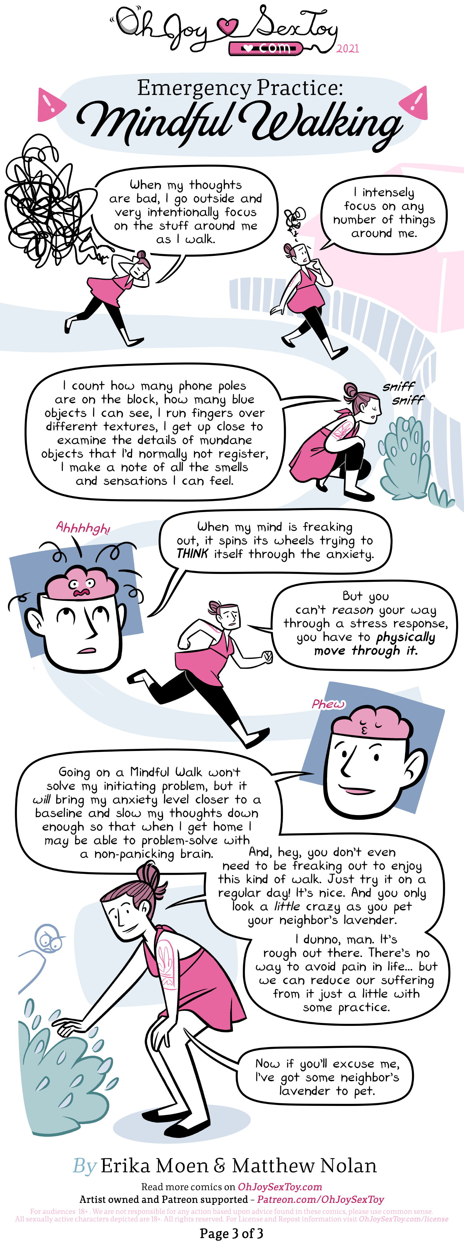 “Going on a Mindful Walk won’t solve my initiating problem, but it will bring my anxiety level closer to a baseline and slow my thoughts down enough so that when I get home I may be able to problem-solve with a non-panicking brain. And, hey, you don’t even need to be freaking out to enjoy this kind of walk. Just try it on a regular day! It’s nice. And you only look a little crazy as you pet your neighbor’s lavender. I dunno, man. It’s rough out there. There’s no way to avoid pain in life… but we can reduce our suffering from it just a little with some practice.”