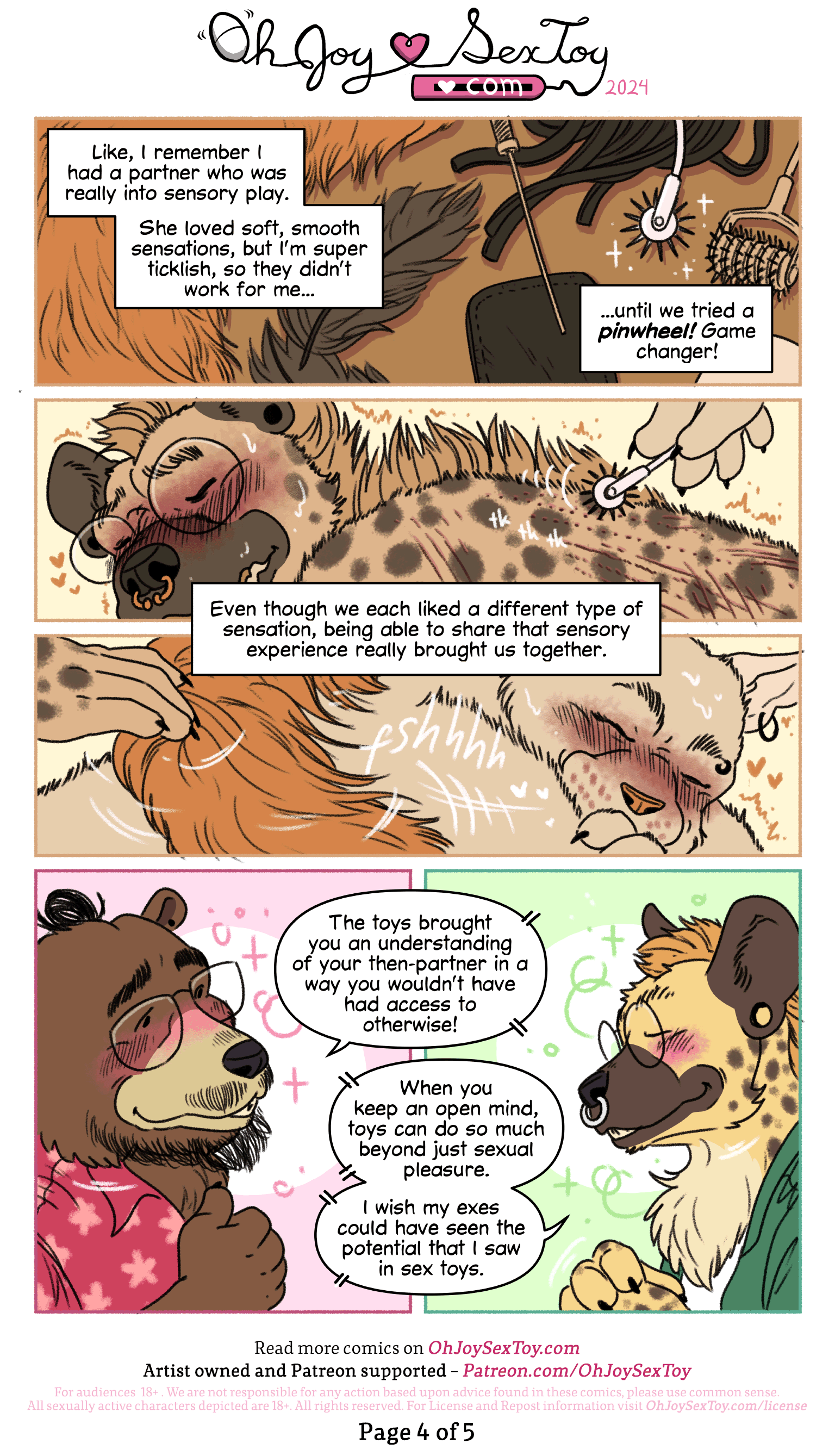 In Ziggy's sepia-colored flashback, his narration reads, "Like, I remember I had a partner who was really into sensory play. She loved soft, smooth sensations, but I'm super ticklish, so they didn't work for me..." Feathers, a flogger, a paddle, a pokey tool, and a multi-wheeled rolling tool are laid out on a surface, all tinted brownish. A single pinwheel tool stands out against the rest in shining white. "...until we tried a pinwheel! Game changer!"