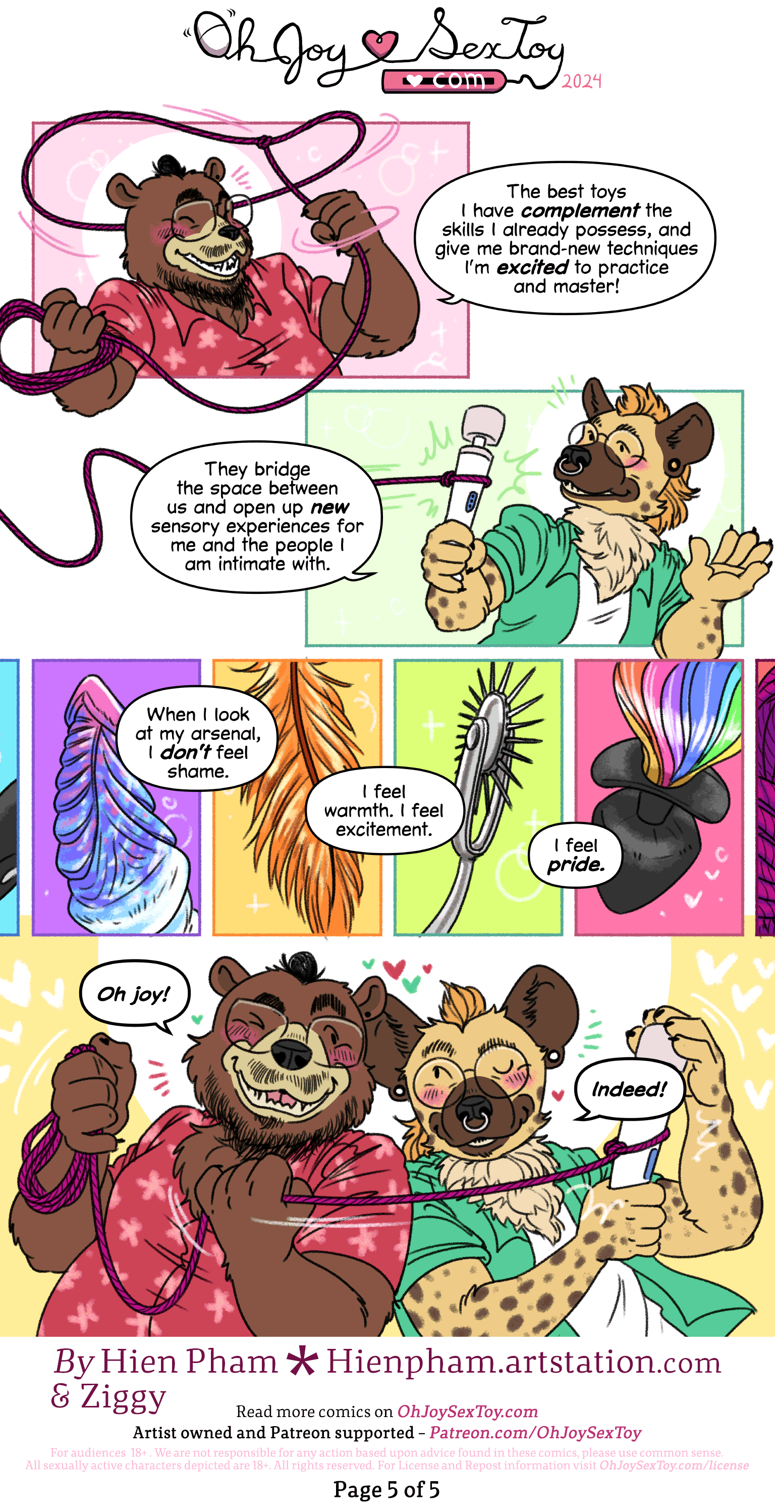 Across a montage of sex toys, both Hien and Ziggy's intermingling texts read, "When I look at my arsenal, I don't feel shame. I feel warmth. I feel excitement. I feel pride."