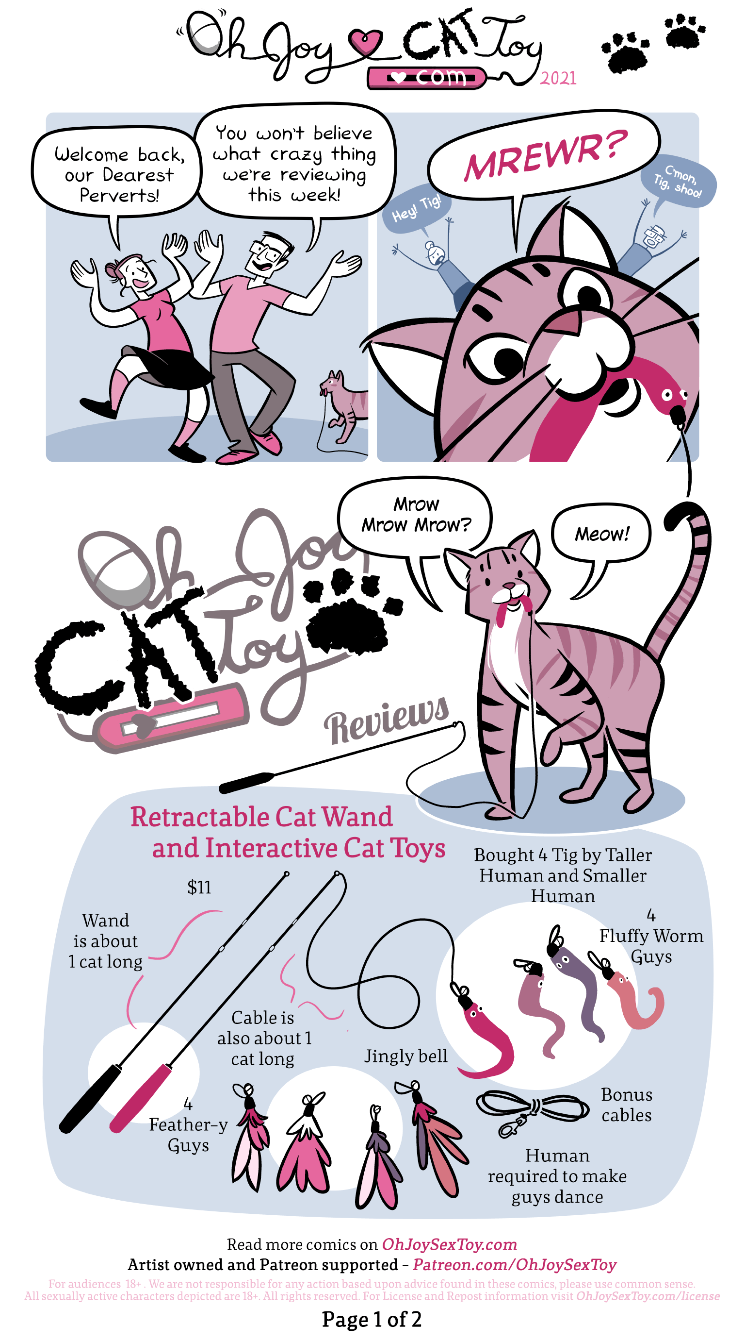 Text: OJST Reviews Retractable Cat Wand and Interactive Cat Toys. Bought 4 Tig by Taller Human and Smaller Human.