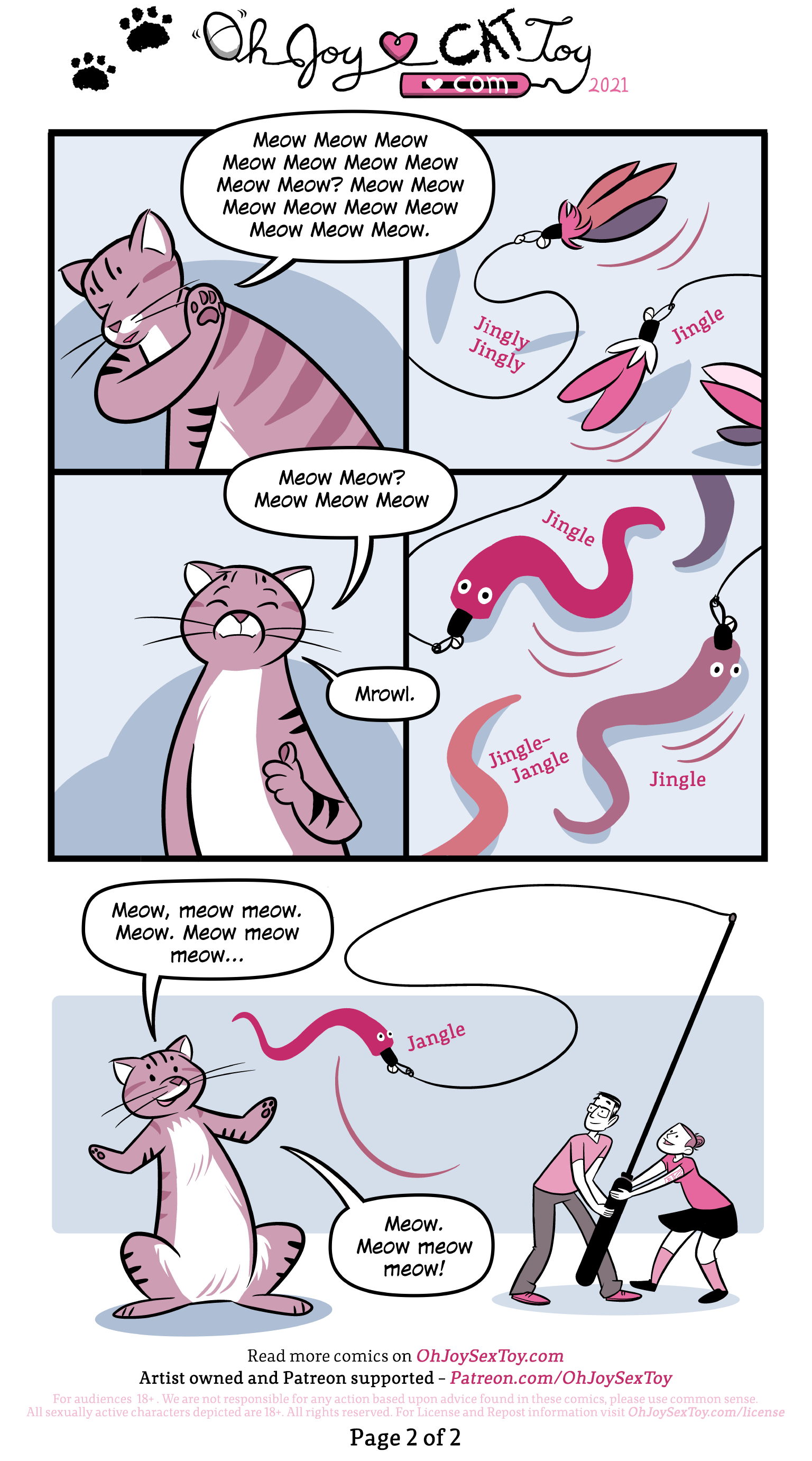 Tig stands next to the Oh Joy Sex Toy logo with the furry worm in her mouth still, but now you can see it's connected to a wand by a string. The OJST logo has JOY covered up with the words CAT and a big paw print.