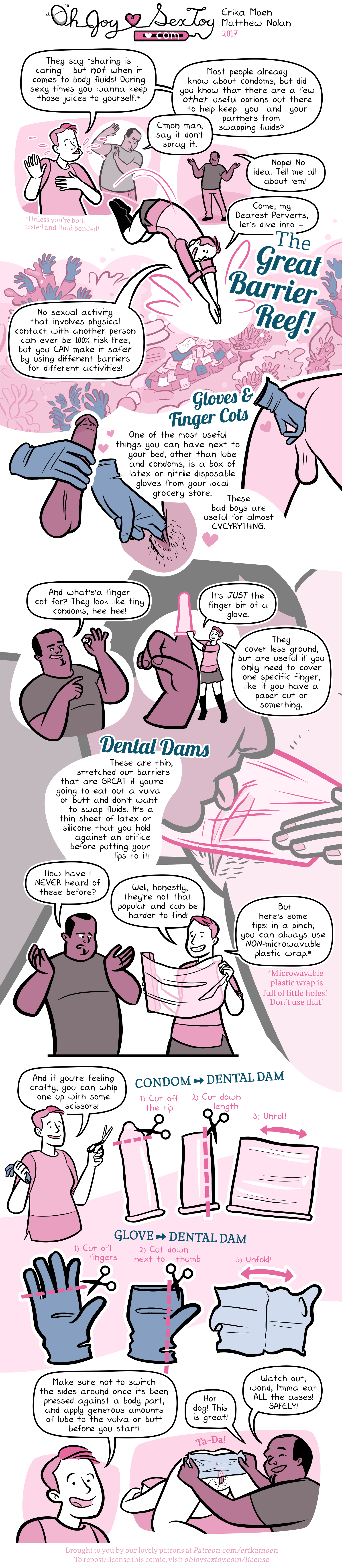 Sharing bodily fluids can be a bit of a scary and risky thing to do nowadays. Thankfully there are a BUNCH of barriers out there. Today we finally cover some of the more important ones outside of condoms, with our personal recommendation that you get yourself a box of cheap nitrile gloves for the side of the bed – so darn useful.