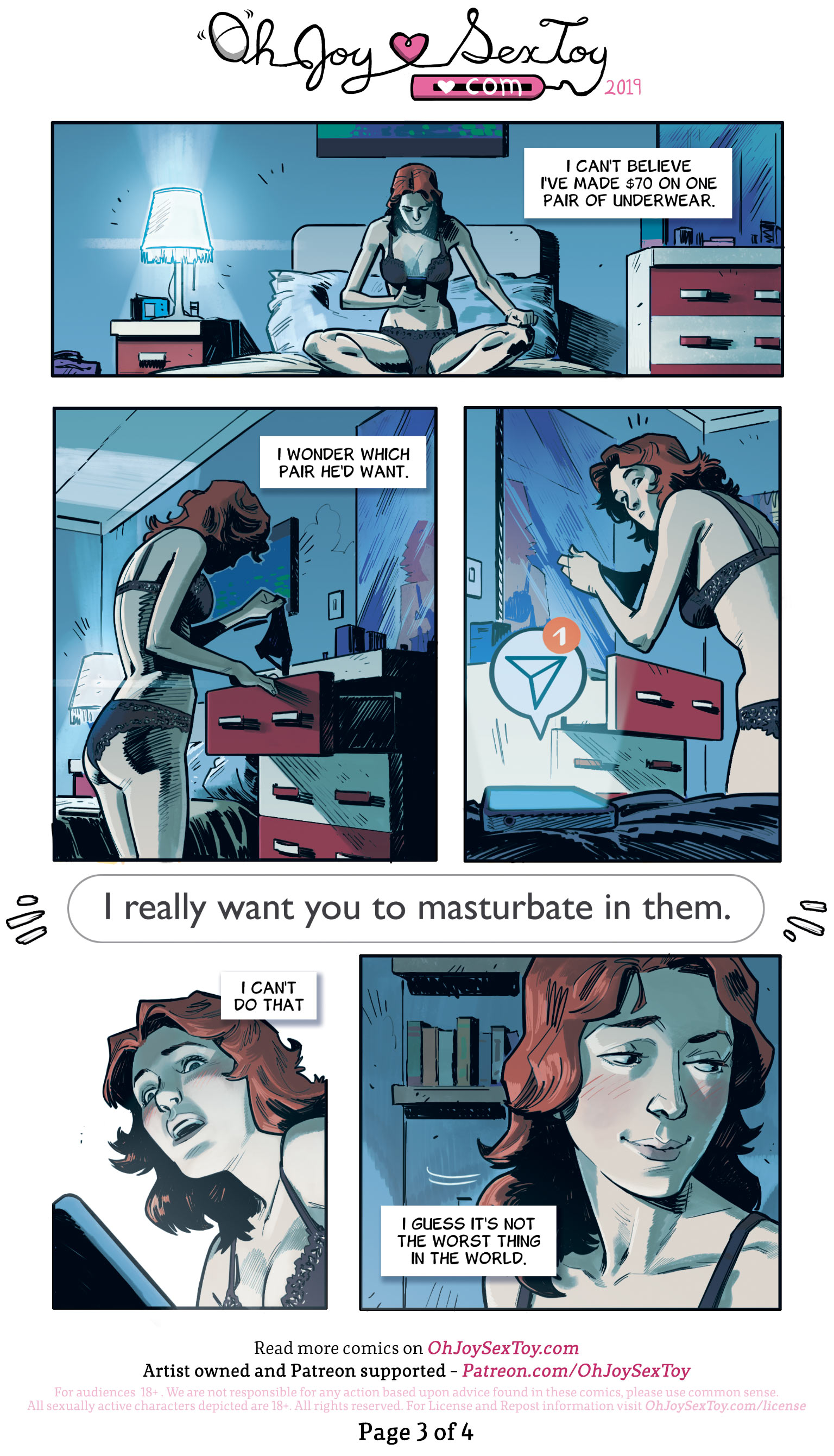 – Today’s comic is fiction, buying panties doesn’t mean you’ll be sparking romantic relationships in real life through the used-panties trade. Treat others respectfully and practice good sexting etiquette, ask if the person on the other end of the screen wants to talk saucy before you dive.