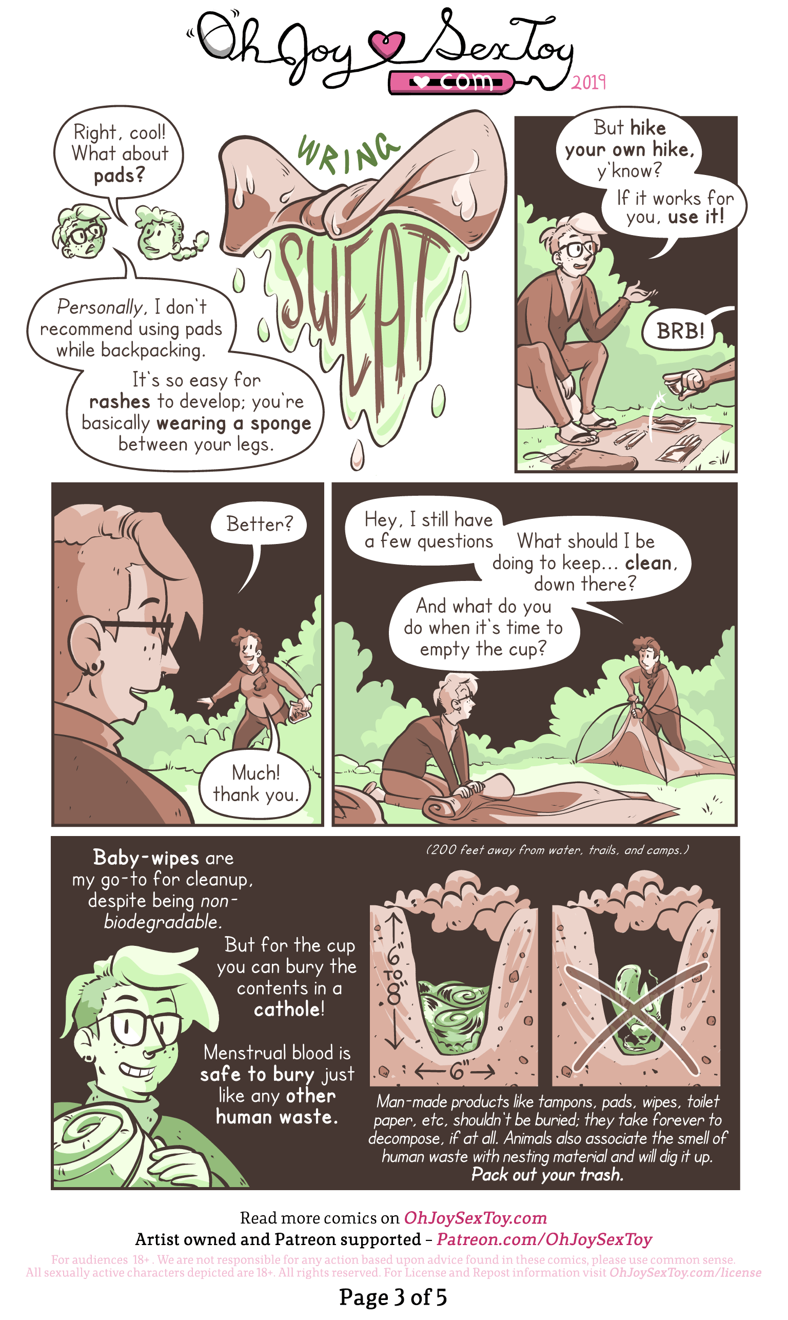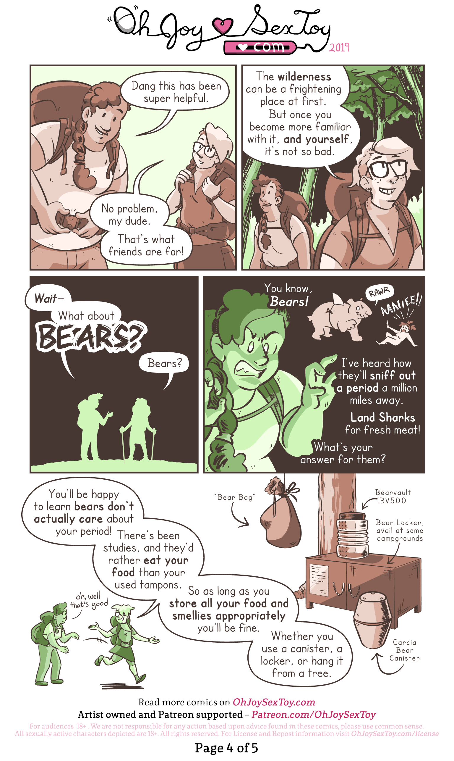 Friend: Plus, uh, this is my first period while backpacking... There are some things bugging me. Like... how do I keep clean down there? My hands are filthy, could I give myself an infection with these grubby fingers in my delicate bits? What do I even do with blood soaked pads? WHAT ABOUT BEARS? Maybe we should go home...