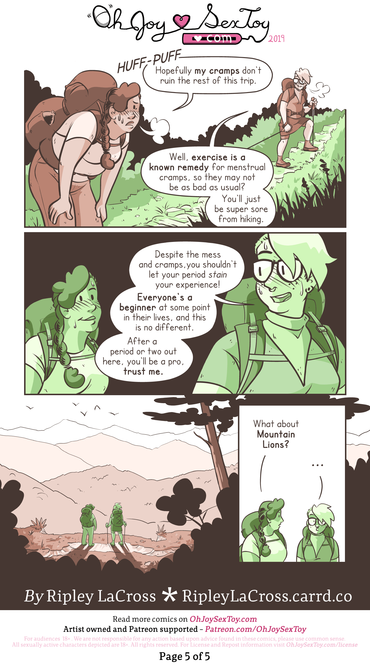 Ripley: Well, exercise is a known remedy for menstrual cramps, so they may not be as bad as usual? You'll just be super sore from hiking. Despite the mess and cramps, you wouldn't let your period stain your experience! Everyone's a beginner at some point in their lives, and this is no different. After a period or two out here, you'll be a pro, trust me.