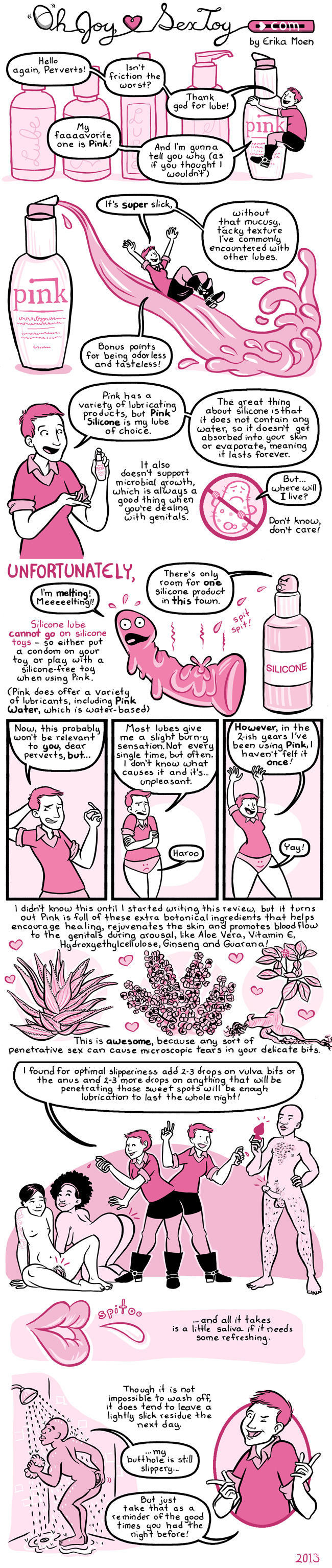 Oh my g-g-g-goooooooooooosh, I love Pink lube, it is so good to me. Like I mentioned in the comic, one of the nice things about starting this review comic is that it’s forcing me to actually do some extra research about the products I’ve been using for years and I’m learning all this cool stuff– like how Pink uses all those natural supplements like Aloe Vera and Vitamin E in it, which I’m pretty sure is why it doesn’t cause that burn-y feeling I get from pretty much all other lubes. So, that’s cool!