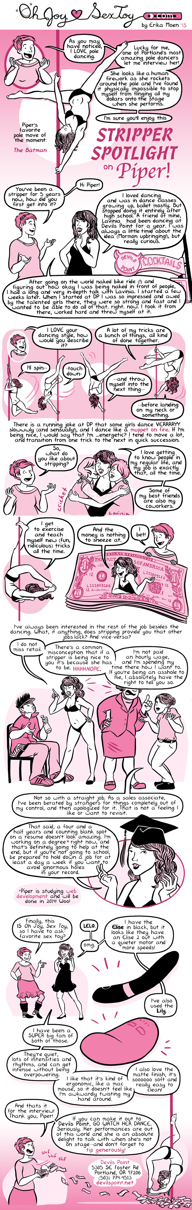 Oh my gosh, I’m beyond stoked Piper sat down with me (well, over email. I assume she was sitting? I was!) to talk about pole dancing, stripping and her life! I could only include a tiny excerpt in the comic, and I encourage you to read the full transcript below because she’s got a lot of great things to say.
