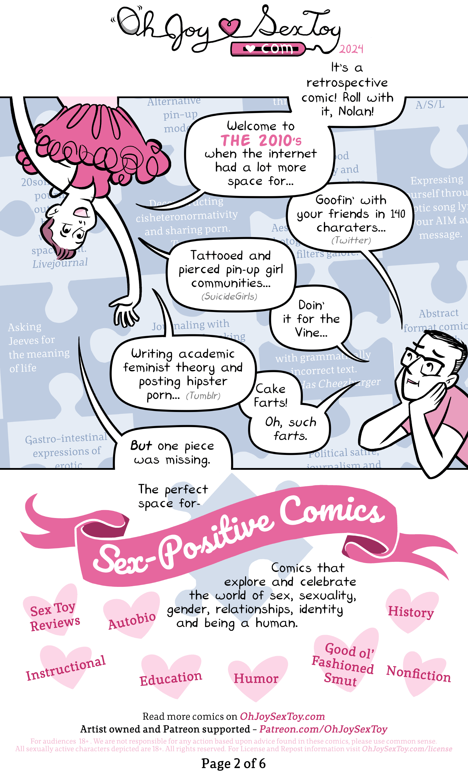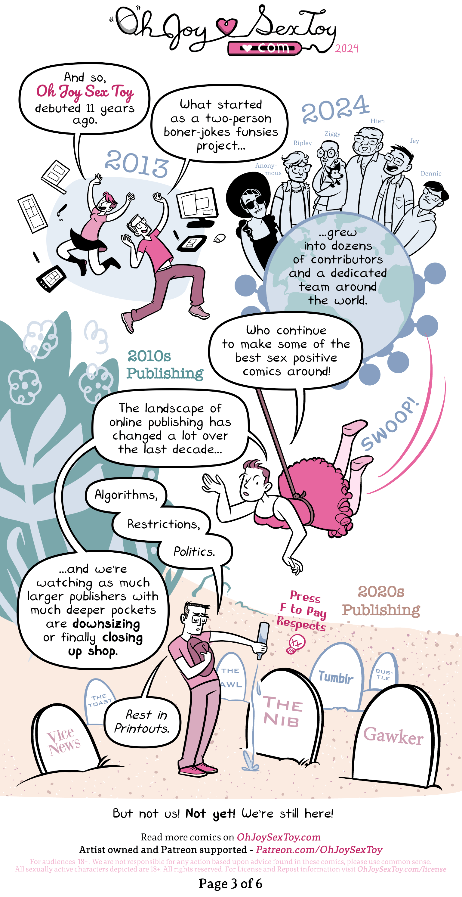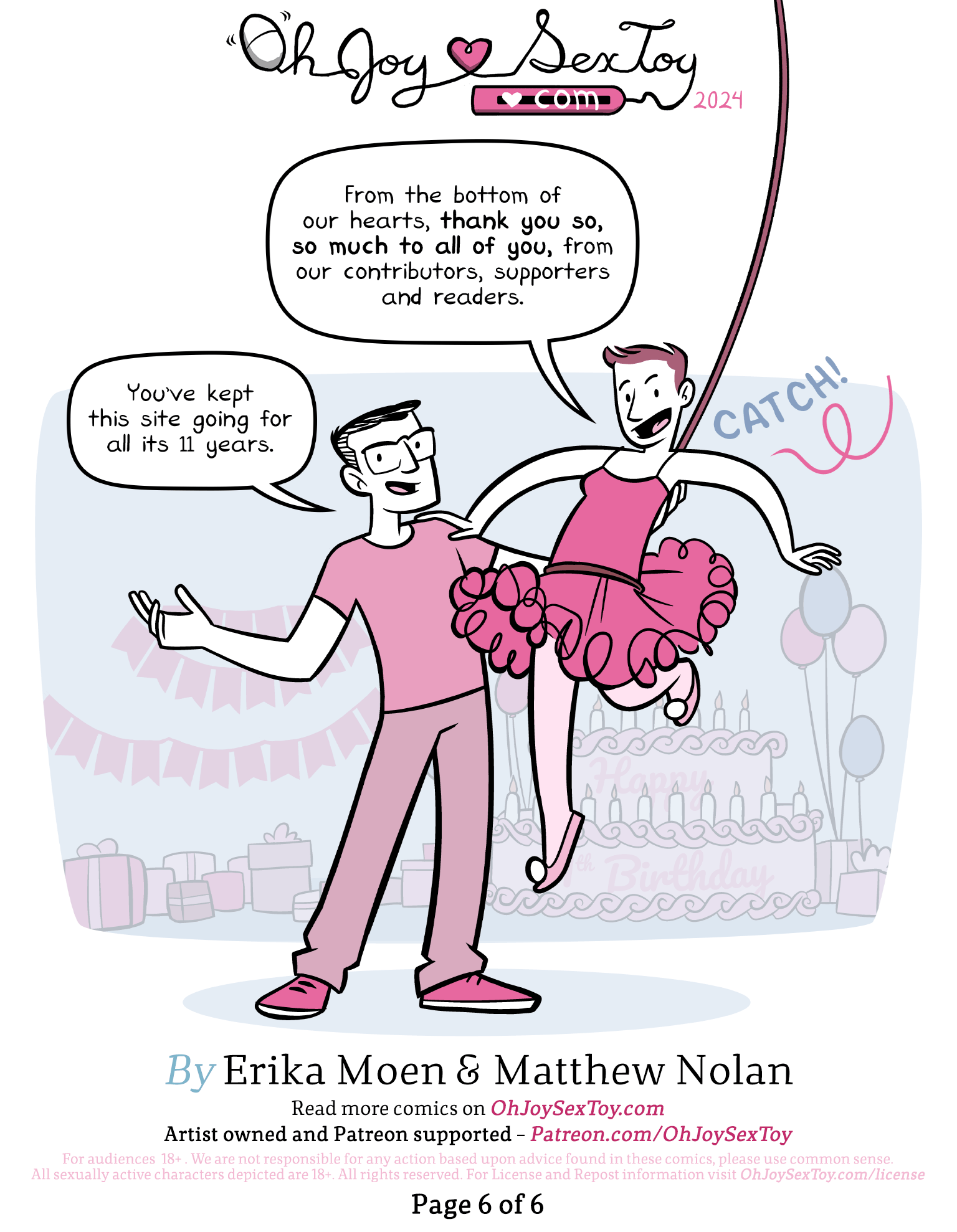 Hot damn! Oh Joy Sex Toy turns 11 this year on April 26th! An insane age for a project we started for funsies-! That’s 572 comics clocking in at roughly 2,860 pages of creator-owned sex-positivity. To celebrate, we’ve got a month of bonus comics exclusively releasing on: