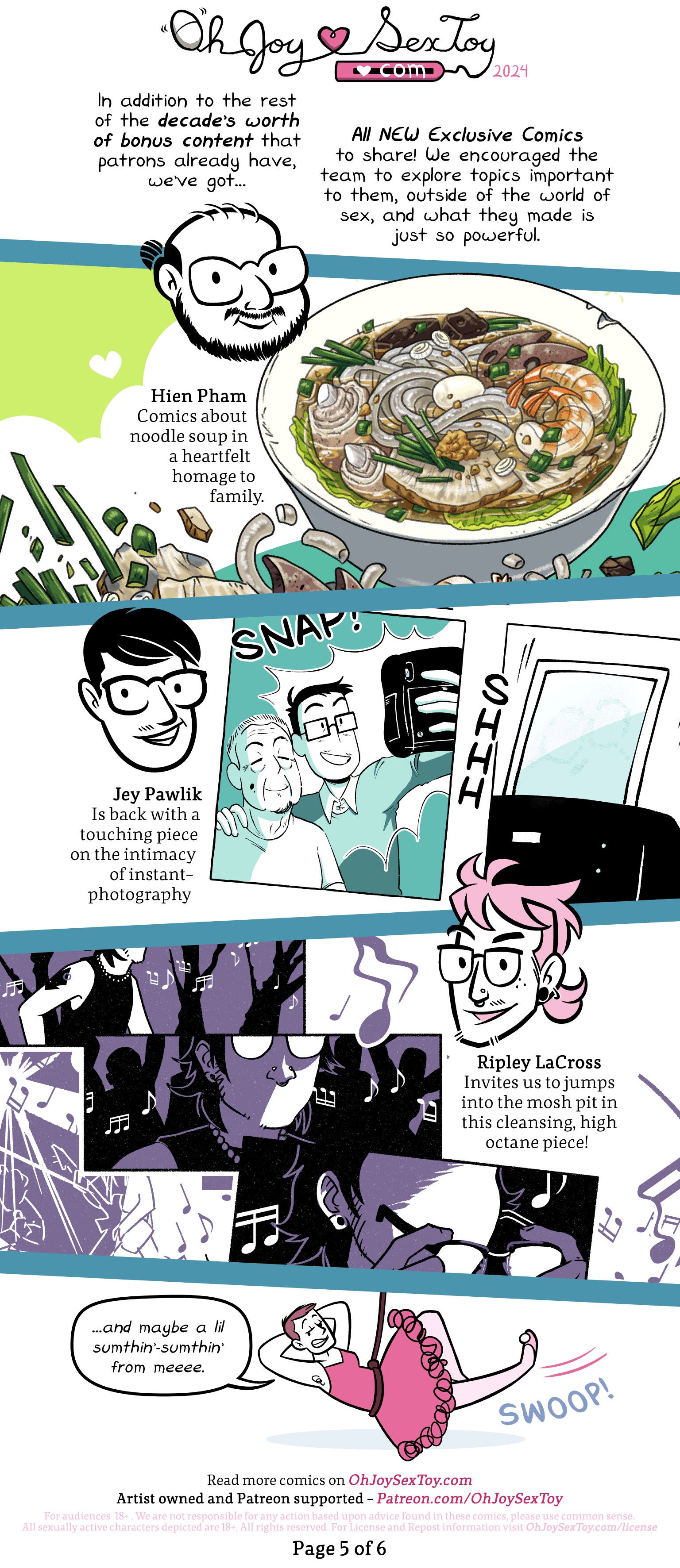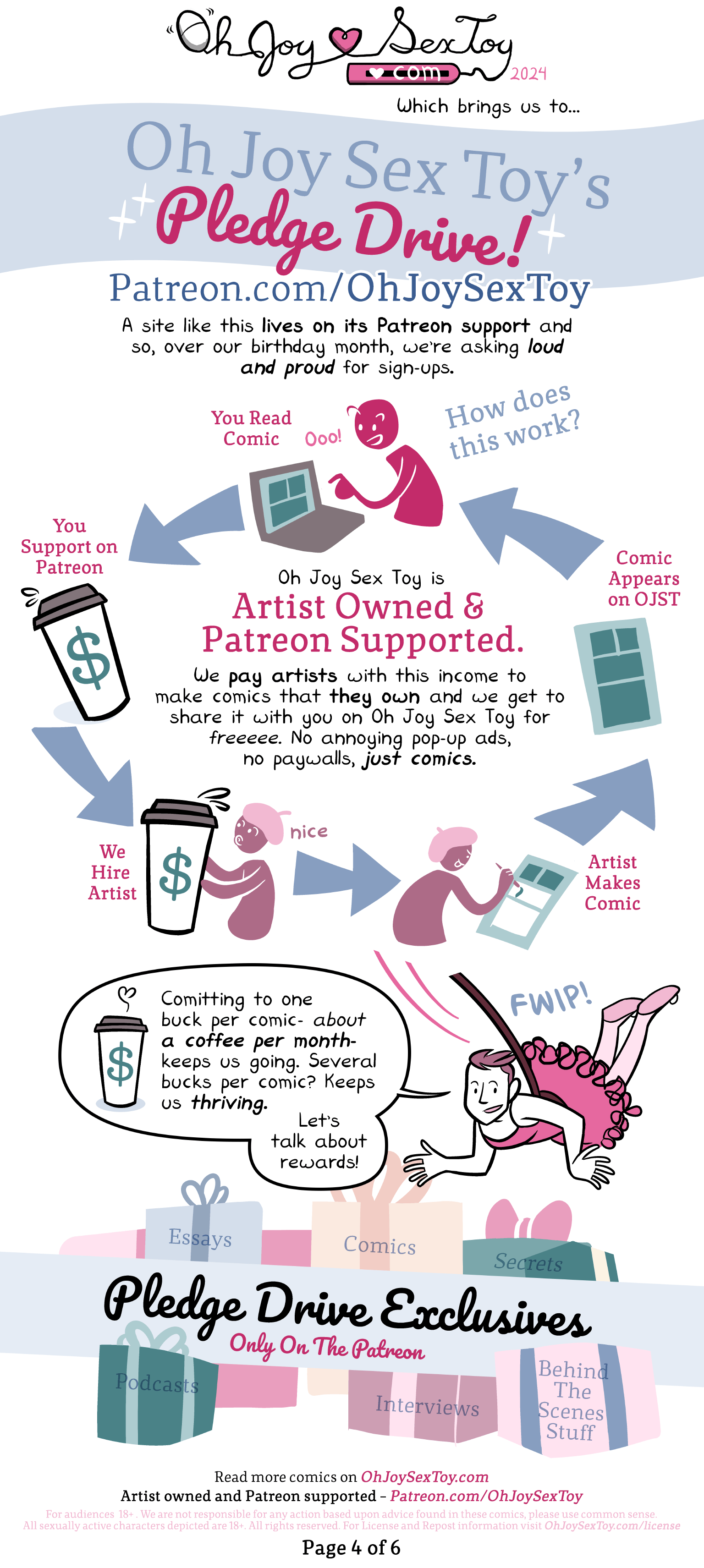 Narration - ‘In addition to the rest of the decades worth of bonus content, that patrons already have, we’ve got… All NEW exclusive, comics to share! We encouraged the team to explore topics important to them outside of the world of sex, and what they have made is just so powerful.’
