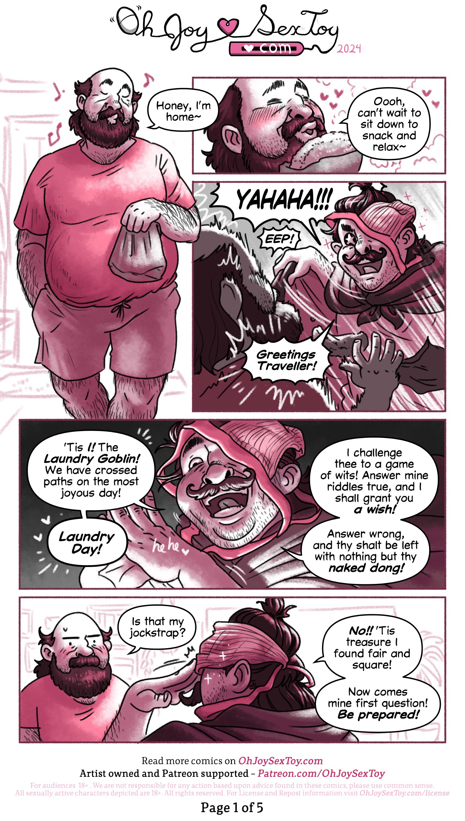 Page 1 starts with a heavy-set white male appearing character in shorts and a T-shirt walking back into his home, he wears a brown beard and his baulding on top. In his hand, he’s carrying some food in a Takeaway bag. For simplicity's sake, I will call him Beard!