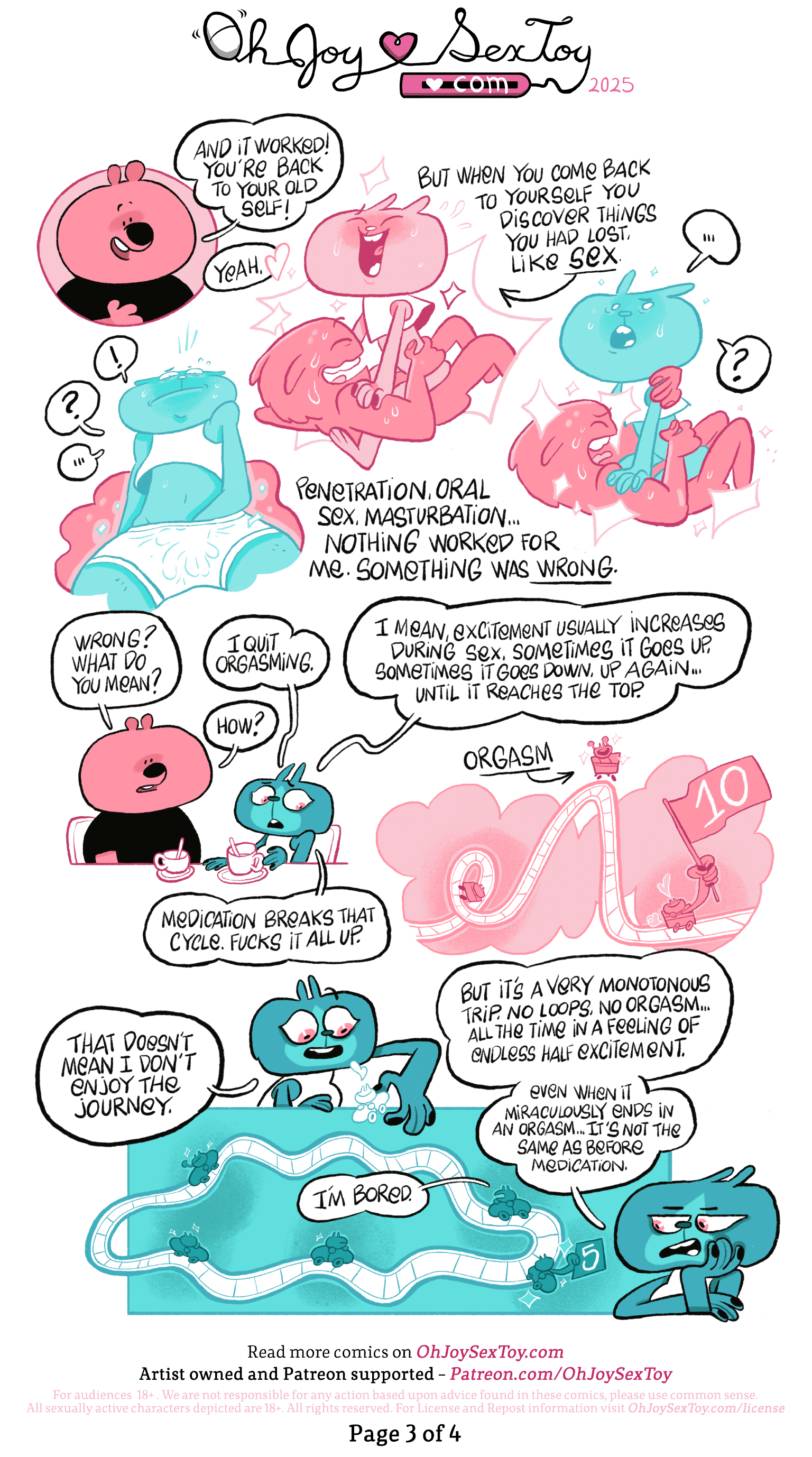 'But when you come back to yourself, you discover things you had lost, like sex.'The sexual scenarios show Cat riding on top of this third person before suddenly realizing that they’re not getting the same reaction or effects on their body that they used to, and they look surprised. In the third sexual scenario, they are by themselves, touching their genitalia with exclamations and question marks floating around them, as their bits obviously don’t feel the same way that they used to.