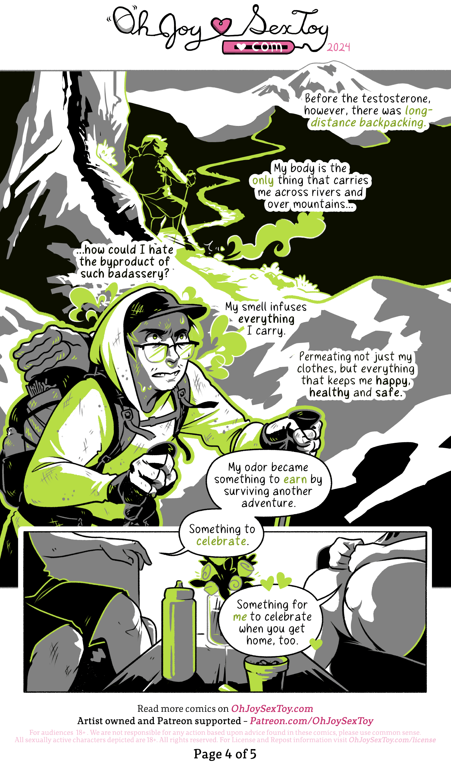 Narration: My body is the only thing that carries me across rivers and over mountains... how could I hate the byproduct of such badassery? My smell infuses everything I carry. Permeating not just my clothes, but everything that keeps me happy, healthy and safe. My odor became something to earn by surviving another adventure. Something to celebrate."