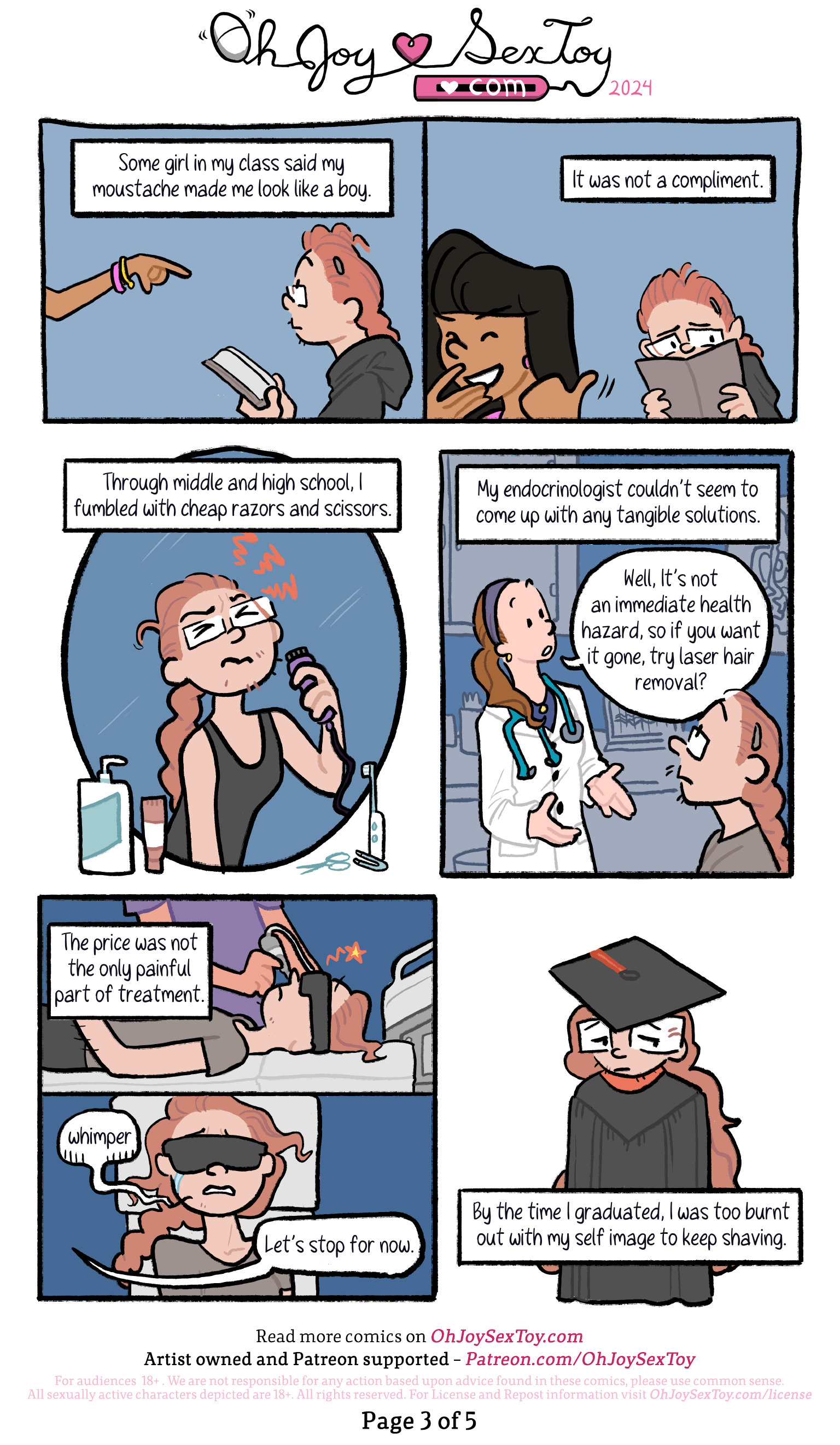 Senna is seen at her laptop, getting excited to find a "Hirsutism forum" in one panel and then looking away in frustrated resignation in the next as the forum goes on discuss "Best razors???"