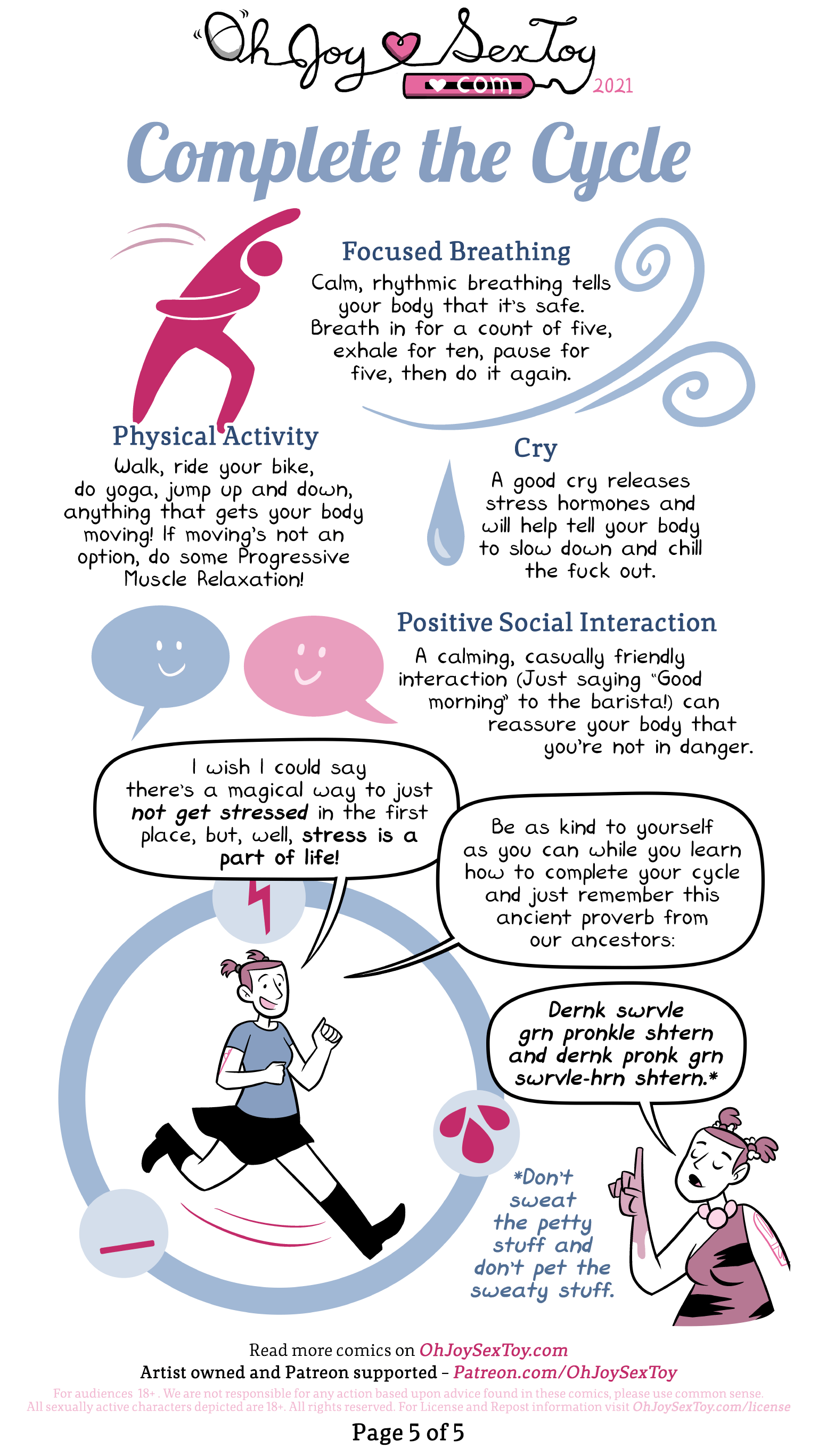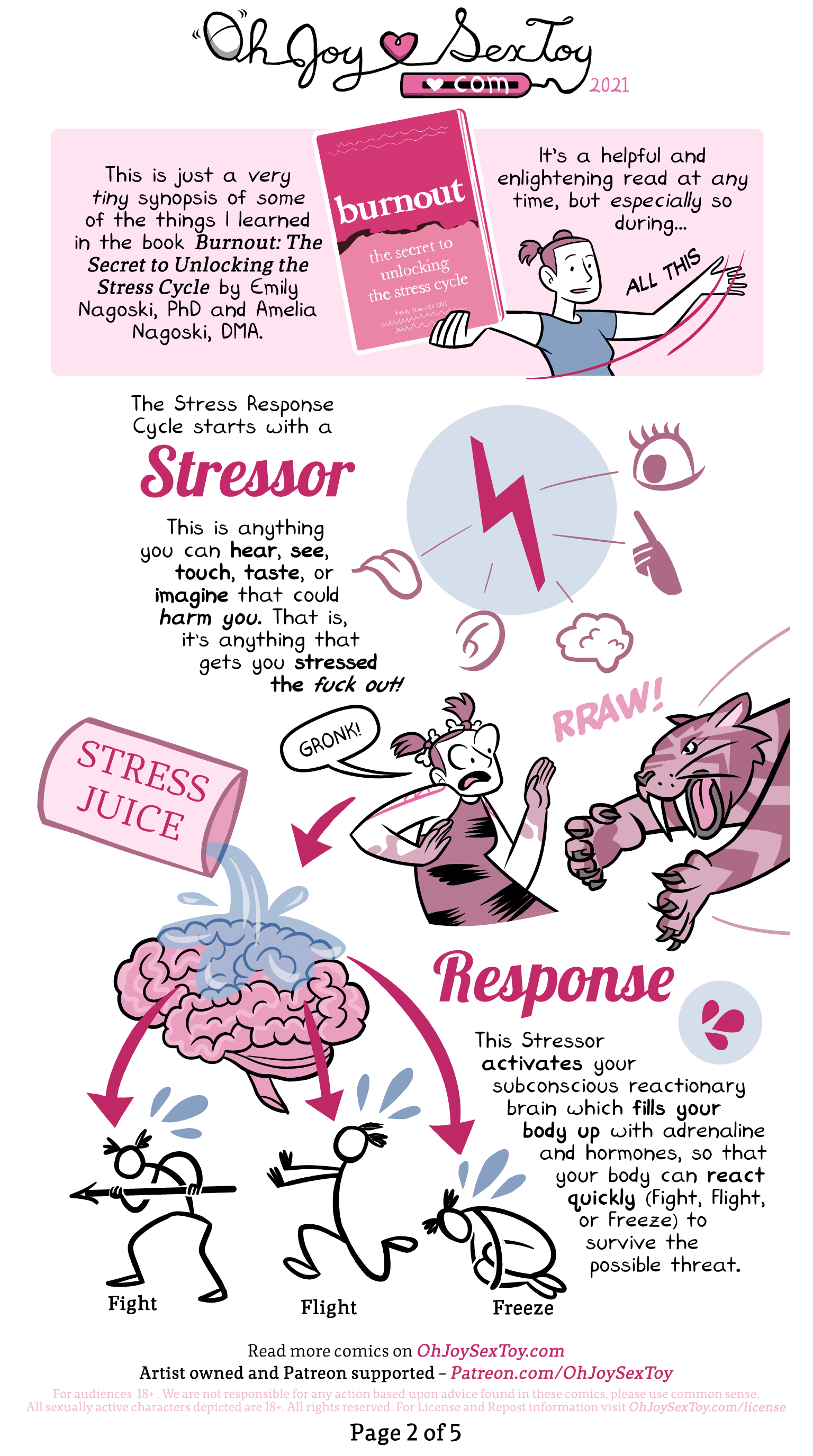 “How to De-stress” on Women’s Health Magazine goes more in-depth with some of the methods you can use to complete the stress cycle. God only knows I’m trying my best when I summarize big concepts into simplified comics and my Cliff Notes version is bound to come up short to the original theory, so I really truly encourage everyone to read my source material for yourself by picking up a copy of Emily and Amelia Nagoski’s book: