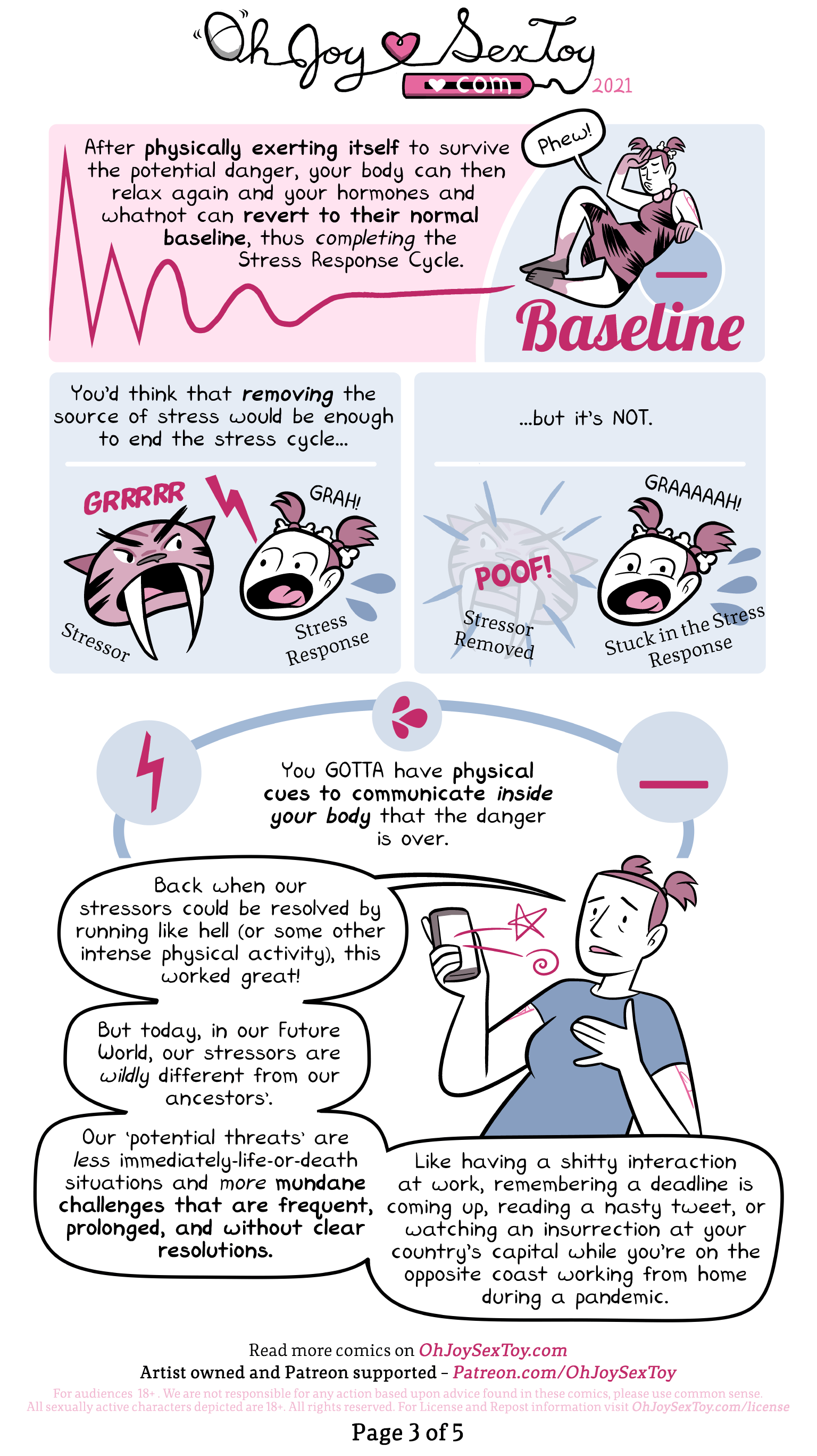 After physically exerting itself to survive the potential danger, your body can then relax again and your hormones and whatnot can revert to their normal baseline, thus completing the Stress Response Cycle.
