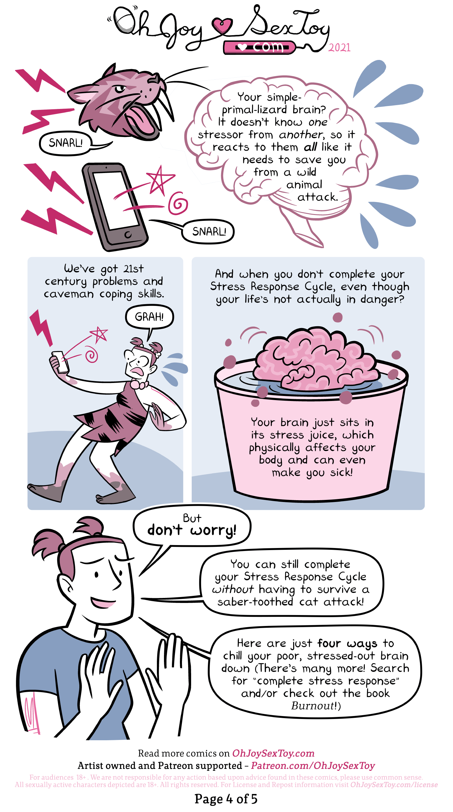 Erika puts her hands up reassuringly. “But don’t worry!” She says. “You can still complete your Stress Response Cycle without having to survive a saber-toothed cat attack! Here are just four ways to chill your poor, stressed-out brain down.” She adds in parenthesis, “(There’s many more! Search for ‘complete stress response’ and/or check out the book Burnout!)”.