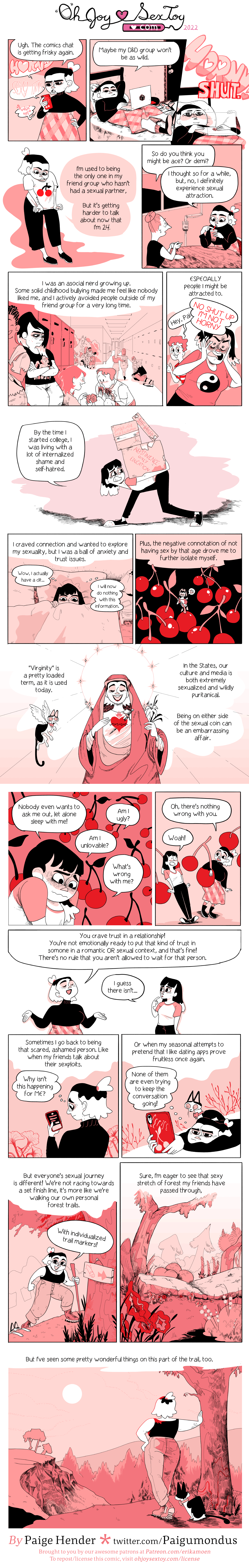 Paige Hender shares with us a lovely thoughtful autobio comic about ‘virginities’, sexual experiences, and living in a world where there’s so much pressure to live and go fast. It’s a lovely reminder that we don’t have to rush things and that you can set whatever pace you like when it comes to the world of sex. Thank you Paige, it’s thoughtful and beautiful and Oh Joy Sex Toy is lucky to have it!
