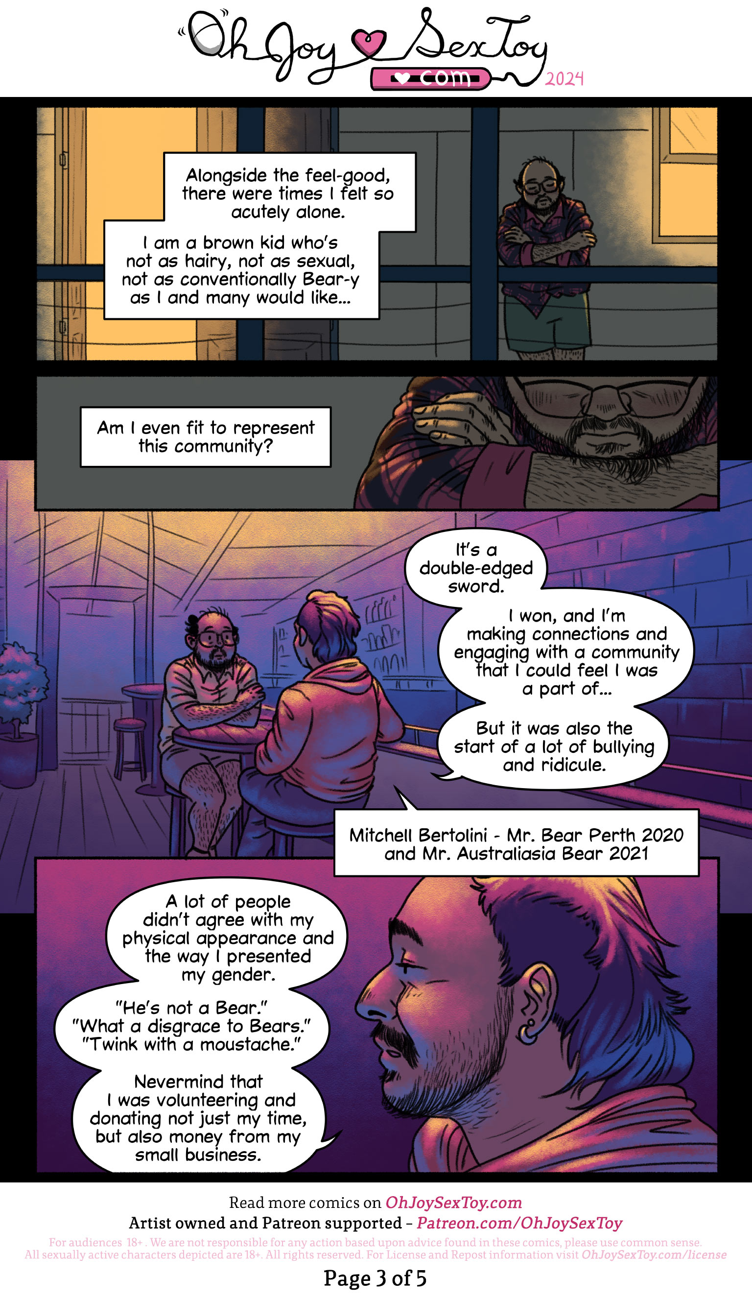 "It's a double-edged sword." Mitch tells Hien. "I won, and I'm making connections and engaging with a community that I could feel I was a part of... But it was also the start of a lot of bullying and ridicule. A lot of people didn't agree with my physical appearance and the way I presented my gender. 'He's not a Bear.' 'What a disgrace to Bears.' 'Twink with a moustache.' Nevermind that I was volunteering and donating not just my time, but also money from my small business."