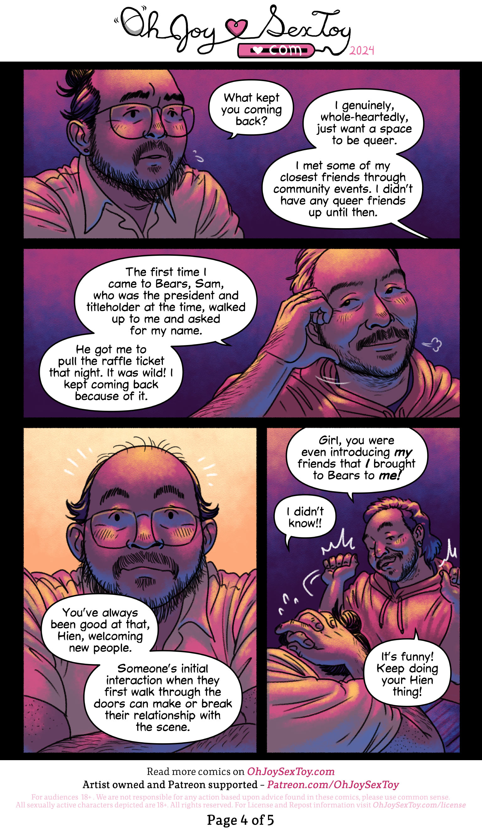Hien's face lights up as Mitch tells him, "You've always been good at that, Hien, welcoming new people. Someone's initial interaction when they first walk through the doors can make or break their relationship with the scene. Girl, you were even introducing *my* friends that *I* brought to Bears to me!"