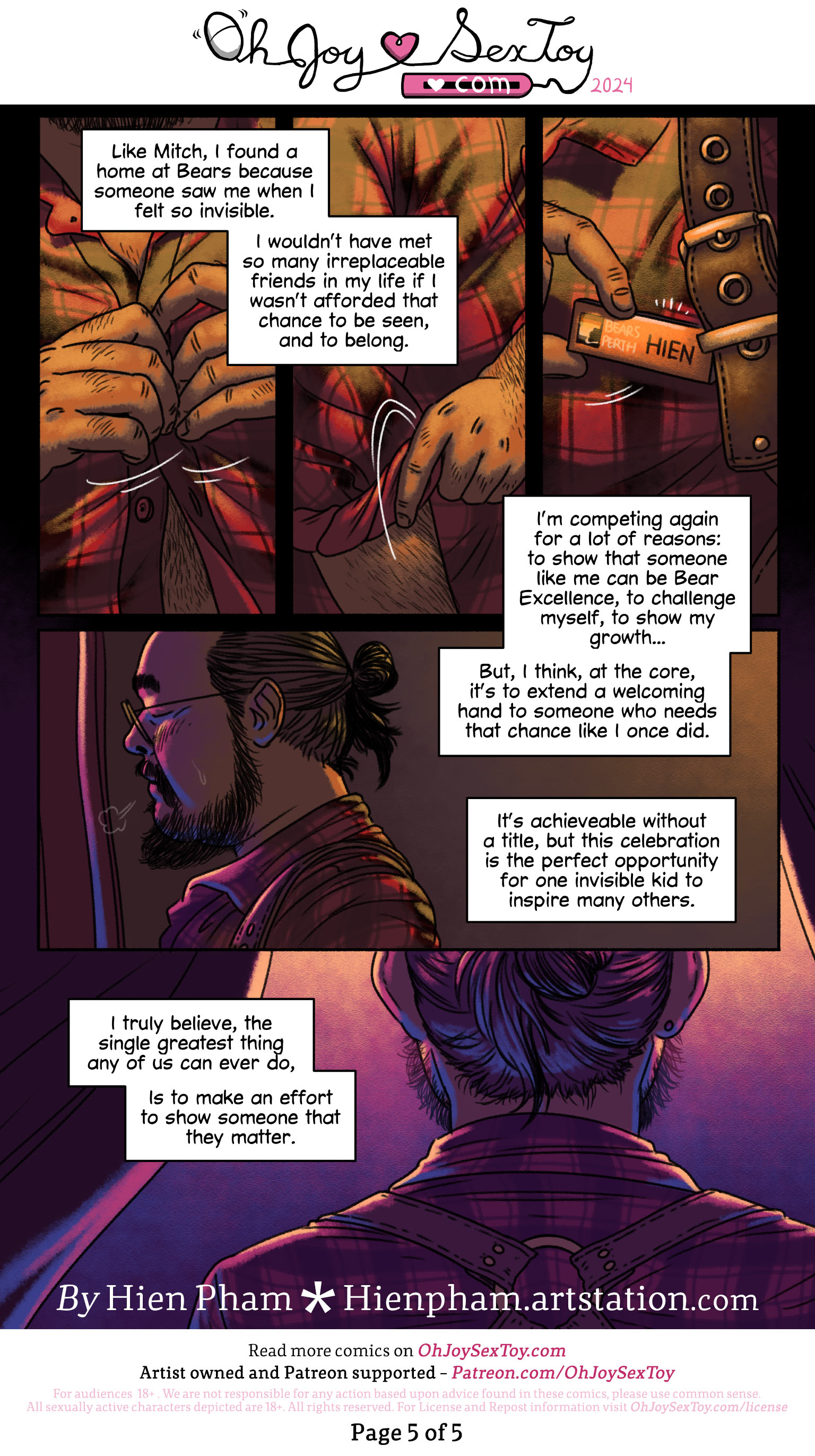 Hien Pham sits down and talks about community, titles, representation and celebration surrounding this friendly-competition for Perth’s next Mr. Bear pageant. Hien masterfully shares a short interview and slice of introspection in this beautiful comic. That’s a lot of words for: ‘I love this comic, and think you will too!’