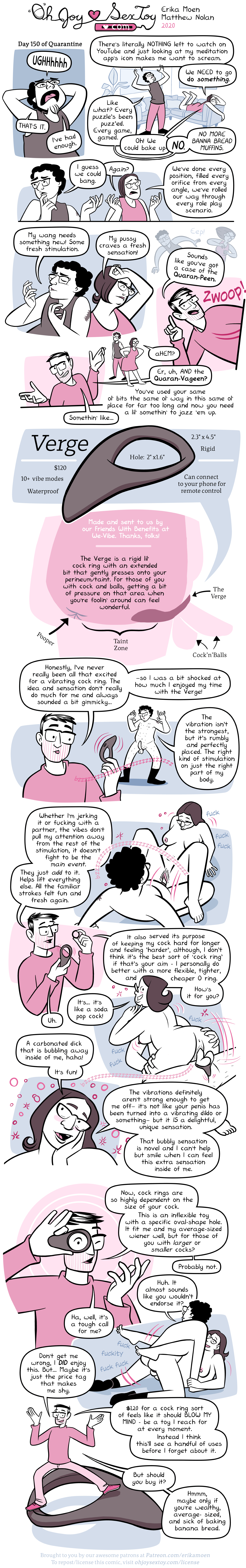 This dang-dingle-donger is… really fantastic! It does exactly as it describes on the tin and the We-Vibe team know how to make a really great product. It IS a very good vibrating cock ring. Buuuuut would I drop $120 to pick one up? I’m not sure, no, probably not. But that’s probably on me: I’ve just never been a big fan of vibrations and I’ve always felt like the basic O-ring was ring enough for ol’ Matt. So I’m probably the wrong guy for this particular toy! Would I judge you for picking a Verge up? Absolutely not! If you’re in the market, it really IS a wonderful vibrating cock ring.
