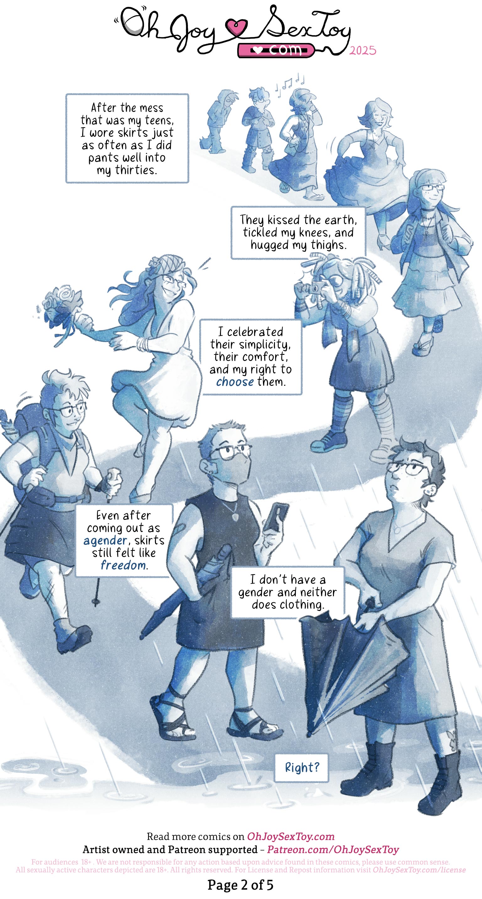 The entire white page is cut with a grey-blue watercolor pathway that snakes across and down it. The art style is the same as the previous page, but instead of crisp, clear digitally-drawn linework, it looks like everything is drawn with a softer pencil and painted with blue-gray watercolor paint on textured paper. Far in the distance at the start of the path is a hunched over, indistinct figure walking in baggy, ratty jeans and a hoody pulled up over their bushy, scraggly hair. Infinitesimally closer is the same figure, but now standing more upright, their bushy, short hair uncovered. They fidget with their fingers while continuing to walk forward, but now they are in a boxy knee-length skirt, fishnets, and big chunky boots. Music plays faintly in the background. The next figure continuing the walk wears a beret underneath big headphones that connect to a music player inside their purse. They wear a tanktop with a long skirt and flipflops. The next figure is close enough to show their face a little clearer now. Their shin-length hair flairs in almost-curls at the ends and they lift their multi-playered skirts to avoid tripping while they walk. They are clearly at a special event because they wear a pearl necklace with long opera gloves and fancy little high heels. This leads to the person with bangs and long hair that goes down past their shoulders. They wear a choker and multiple strands of necklaces. Their hands hold the straps of their backpack that they wear over their open, fluttering collared button-up shirt that flutters around their tight tanktop that tops their calf-length ruffled skirt and thick sandals.