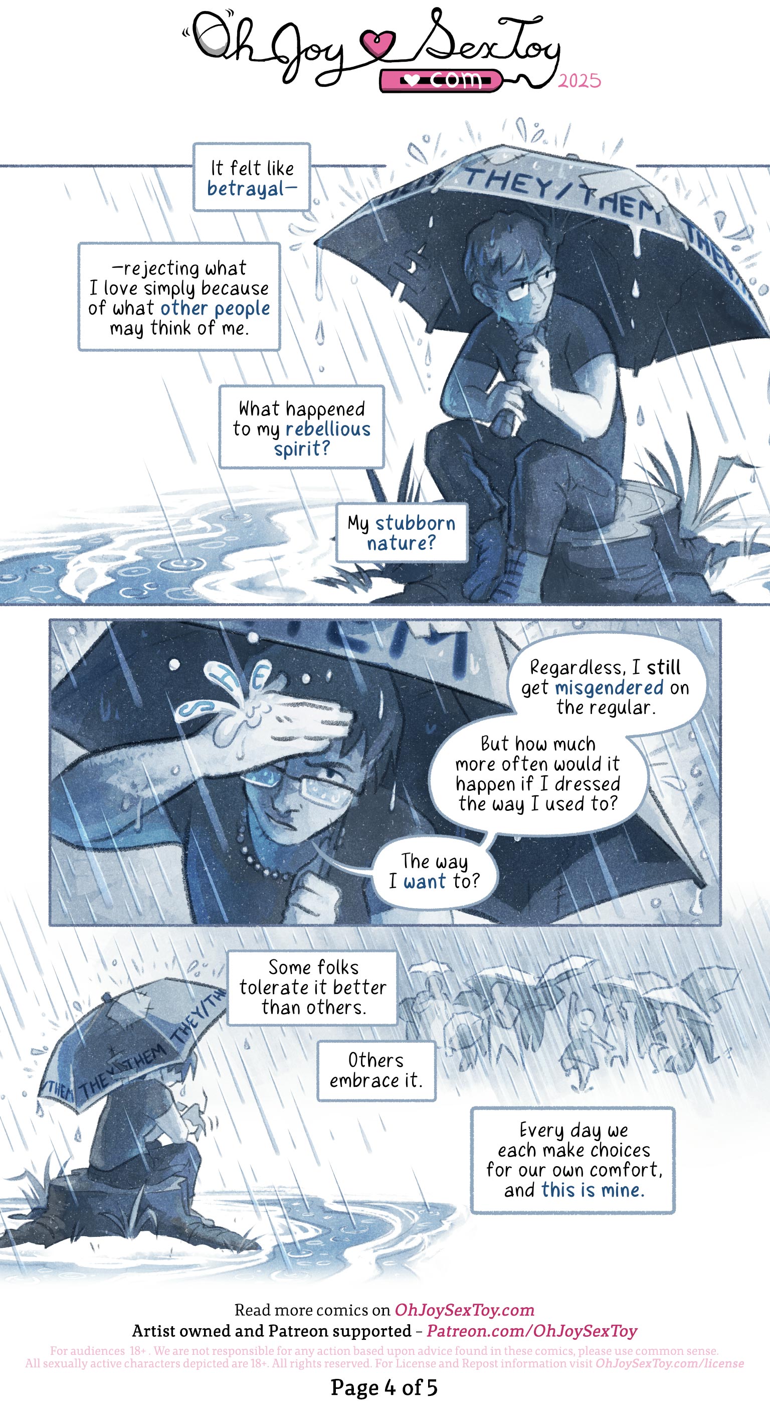 From overhead, we look down over Ripley as they look up at us defiantly, saying, "Regardless, I still get misgendered on the regular. But how much more often would it happen if I dressed the way I used to? The way I want to?" A giant "S H E" rain drop splashes against their hand that shields their eyes.