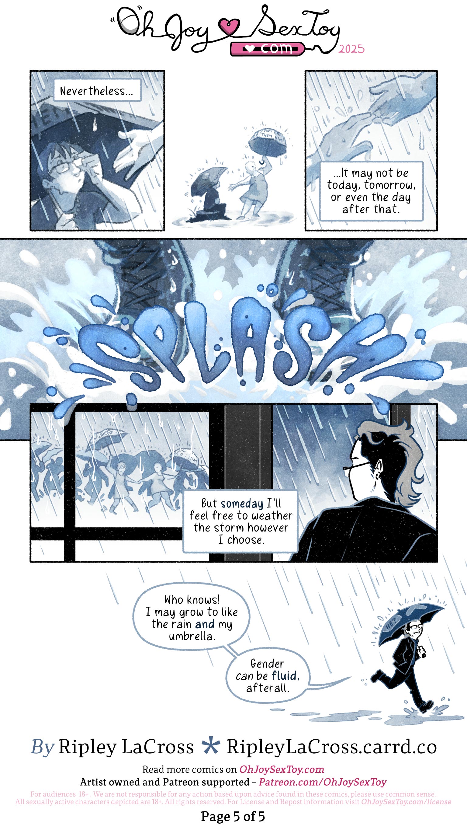 Once again, all panel borders disappear, revealing a blank white page as a small Ripley briskly struts through the shallow puddles to the far right side of the page. The rain continues, but Ripley looks confident under their umbrella. "Who knows!" They say to us with a smile. "I may grow to like the rain and my umbrella. Gender can be fluid, afterall."